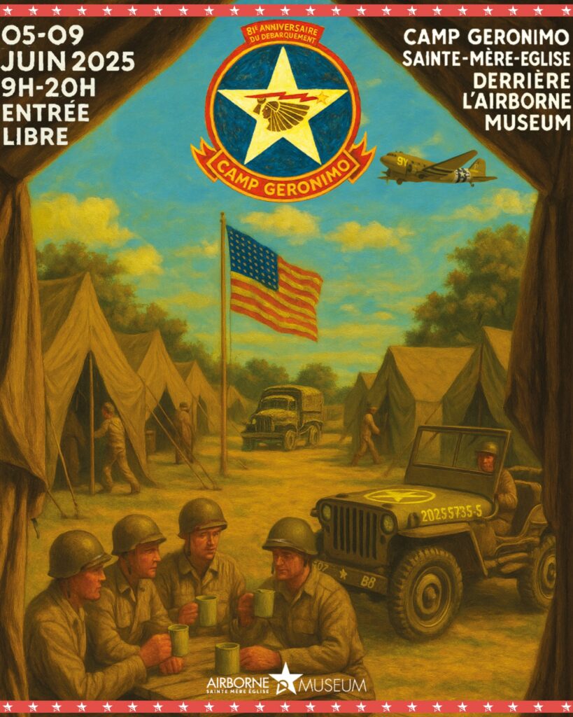 With its vast array of period vehicles, stages and demonstrations, Camp Geronimo, organized by the Airborne Museum for nearly fifteen years, is a must-attend event for the Normandy Landing festivities, and has become one of the biggest American re-enactment camps in France. After a 2024 edition marked by a duration and number of activities in keeping with the event that was the 80th anniversary, this year Camp Geronimo returns to a normal configuration, which nevertheless yields nothing to the quality of its events.